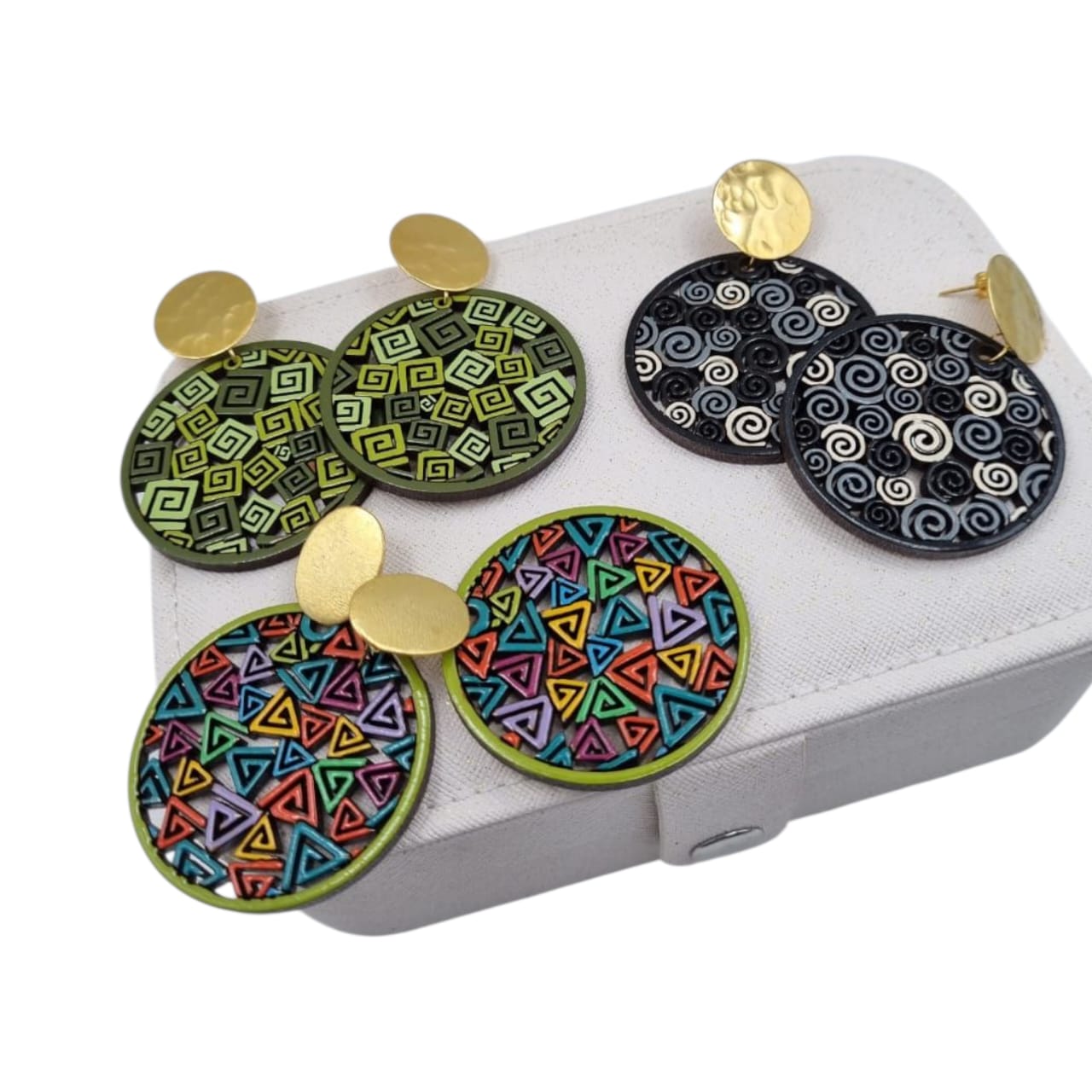 Aretes pintados a mano en madera y bronce, super livianos