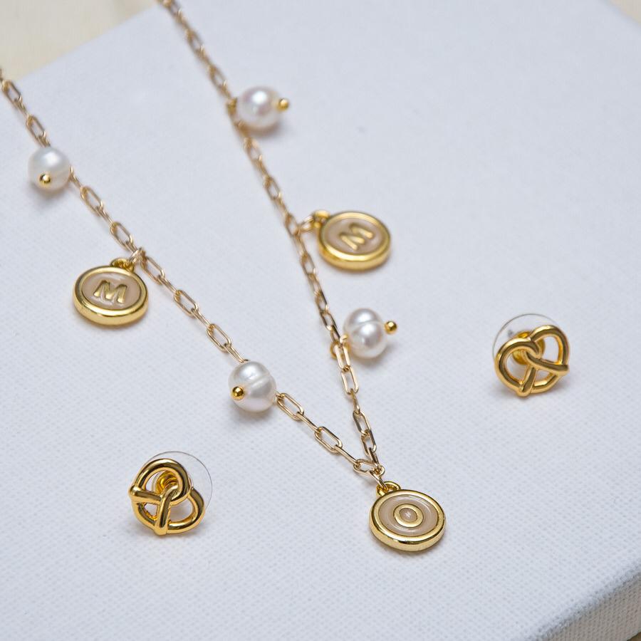 Cadena en baño de oro, con dije MOM , incluye aretes tipo topos pequeños.